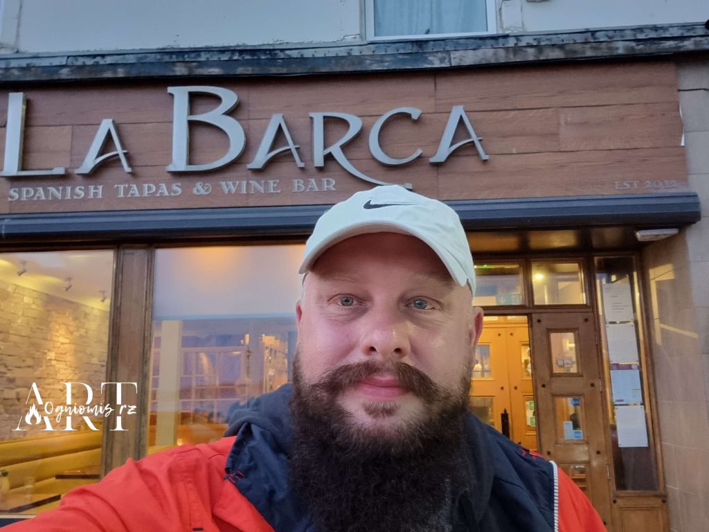 Na kolację, znów zupełnym przypadkiem, trafiamy do hiszpańskiej restauracji La Barca Tapas & Wine Bar. Knajpka którą polecono nam w hotelu była nieczynna, więc szukaliśmy czegoś innego, i to był fantastyczny zbieg okoliczności. Jedzenie jest wyborne, a dyskusja z obsługującym nas Alessandro urocza i pełna śmiechu. Skończyło się na tym, że zaproponowano mi pracę w tym cudownym miejscu i gdyby nie plany na kolejne dni i pozostała część ekipy mógłbym zabawić w Helensburghu nieco dłużej. Olek (bo tak do niego mówiłem, co niezmiernie mu się podobało;) jest Brazylijczykiem i zapalonym kibicem Realu Madryt więc chcąc nie chcąc, dyskusja musiała zejść w końcu na transfer Roberta Lewandowskiego do Barcelony. Wszystko w genialnej atmosferze i z poczuciem humoru. Ale, ale, powinienem chyba napisać co nieco o jedzeniu, zamawiamy duży talerz tapas na który składają się wędliny, sery, oliwki i inne dodatki – wszystko jak zapewnia Olek prosto z Hiszpanii, do tego paella z owocami morza, genialne wprost kalmary i moje danie wieczoru – sezonowany na sucho trzydzieści dni antrykot z farmy Cairnhill w południowo zachodniej Szkocji, a konkretnie w dolinie Girvan nad Atlantykiem z niewyobrażalnie pysznym sosem pieprzowym. To się nazywa orgazm gastronomiczny. Anitka i Inga delektują się stołowym, ale wybornym Monte Di Cello, my ze Zbyszkiem idziemy tym razem w eksperyment zamawiając Estrella Damm – Pilsa prosto z Barcelony i na jednym się nie kończy bo piwko jest naprawdę przednie 😉