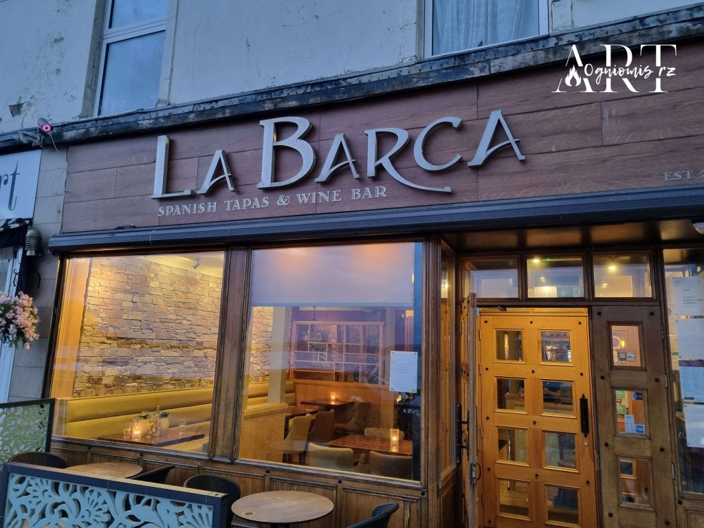 Na kolację, znów zupełnym przypadkiem, trafiamy do hiszpańskiej restauracji La Barca Tapas & Wine Bar. Knajpka którą polecono nam w hotelu była nieczynna, więc szukaliśmy czegoś innego, i to był fantastyczny zbieg okoliczności. Jedzenie jest wyborne, a dyskusja z obsługującym nas Alessandro urocza i pełna śmiechu. Skończyło się na tym, że zaproponowano mi pracę w tym cudownym miejscu i gdyby nie plany na kolejne dni i pozostała część ekipy mógłbym zabawić w Helensburghu nieco dłużej. Olek (bo tak do niego mówiłem, co niezmiernie mu się podobało;) jest Brazylijczykiem i zapalonym kibicem Realu Madryt więc chcąc nie chcąc, dyskusja musiała zejść w końcu na transfer Roberta Lewandowskiego do Barcelony. Wszystko w genialnej atmosferze i z poczuciem humoru. Ale, ale, powinienem chyba napisać co nieco o jedzeniu, zamawiamy duży talerz tapas na który składają się wędliny, sery, oliwki i inne dodatki – wszystko jak zapewnia Olek prosto z Hiszpanii, do tego paella z owocami morza, genialne wprost kalmary i moje danie wieczoru – sezonowany na sucho trzydzieści dni antrykot z farmy Cairnhill w południowo zachodniej Szkocji, a konkretnie w dolinie Girvan nad Atlantykiem z niewyobrażalnie pysznym sosem pieprzowym. To się nazywa orgazm gastronomiczny. Anitka i Inga delektują się stołowym, ale wybornym Monte Di Cello, my ze Zbyszkiem idziemy tym razem w eksperyment zamawiając Estrella Damm – Pilsa prosto z Barcelony i na jednym się nie kończy bo piwko jest naprawdę przednie 😉